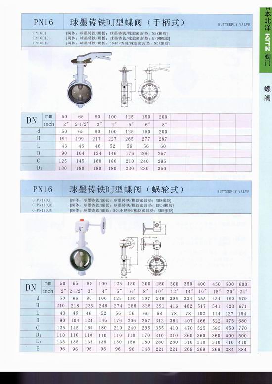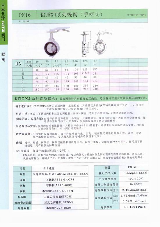 日本北澤KITZ蝶閥蝶閥不僅結構簡單、體積小、重量輕、材料耗用省,安裝尺寸小,而且驅動力矩小,操作簡便、迅速,并且還同時具有良好的流量調節功能和關閉密封特性,在大中口徑、中低壓力的使用領域,蝶閥是主導的閥門形式。手柄式 型號:PN16DJ (球墨鑄鐵蝶板) 蝸輪式 :G-PN16DJ (球墨鑄鐵蝶板) PN16DJU (不銹鋼蝶板) G-PN16DJU (不銹鋼蝶板)