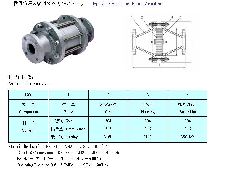大多數阻火器由能夠通過氣體的許多細小、均勻或不均勻的通道或孔隙的固體材質所組成,對這些通道或孔隙要求盡量的小,小到只要能夠通過火焰就可以。這樣,火焰進入阻火器后就分成許多細小的火焰流被熄滅。火焰能夠被熄滅的機理是傳熱作用和器壁效應。(1) 傳熱作用 阻火器能夠阻止火焰繼續傳播并迫使火焰熄滅的因素之一是傳熱作用。我們知道,阻火器是由許多細小通道或孔隙組成的,當火焰進入這些細小通道后就形成許多細小的火焰流。由于通道或孔隙的傳熱面積很大,火焰通過通道壁進行熱交換后,溫度下降,到一定程度時火焰即被熄滅。進行的試驗表明,當把阻火器材料的導熱性提高460倍時,其熄滅直徑僅改變2.6%。這說明材質問題是次要的。即傳熱作用是熄滅火焰的一種原因,但不是主要的原因。因此,對于作為阻爆用阻火器來說,其材質的選擇不是太重要的。但是在選用材質時應考慮其機械強度和耐腐蝕等性能。 (2) 器壁效應 根據燃燒與爆炸連鎖反應理論,認為燃燒炸現象不是分子間直接作用的結果,而是在外來能源(熱能、輻射能、電能、化學反應能等)的激發下,使分子分裂為十分活潑而壽命短促的自由基。化學反應是靠這些自由基進行的。自由基與另一分子作用,作用的結果除了生成物之外還能產生新的自由基。這樣自由基又消耗又生新的如此不斷地進行下去。可知易燃混合氣體自行燃燒(在開始燃燒后,沒有外界能源的作用)的條件是:新產生的自由基數等于或大于消失的自由基數。當然,自行燃燒與反應系統的條件有關,如溫度、壓力、氣體濃度、容器的大小和材質等。隨著阻火器通道尺寸的減小,自由基與反應分子之間碰撞幾率隨之減少,而自由基與通道壁的碰幾率反而增加,這樣就促使自由基反應減低。當通道尺寸減小到某一數值時,這種器壁效應就造成了火焰不能繼續進行的條件,火焰即被阻止。由此可知,器壁效應是阻火器阻火焰作的主要機理。由此點出發,可以設計出知種結構形式的阻火器,滿足工業上的需要。 |