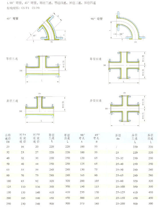 一、YJG型異徑管概述: 聚四氟乙烯襯里防腐蝕管道經過多年來的實際使用,直接影響其使用壽命和性能穩定的因素是溫度、壓力、介質等。優質的材料和先進制造工藝方法是聚四氟乙烯襯里產品的質量保證。本公司自引進與研究整體模壓聚四氟乙烯襯里技術以來,經過工程技術人員多年來的不懈努力,成功研制開發出整體模壓襯里產品,其特點如下: 1、使用溫度高:在強腐蝕介質條件下,可以滿足使用溫度范圍-60℃~150℃,在此溫度范圍內(除了熔融堿金屬、元素氟及芳香烴類外),可滿足所有化學介質。 2、耐真空:在-60℃~150℃范圍內,可在真空條件下使用,在化工生產中,經常由于冷卻、縱向排放、泵閥不同步操作等情況下引起局部真空狀態。 3、耐高壓:在溫度使用范圍內,可承受高達3Mpa的使用壓力。 4、抗滲透:選用優質的樹脂,經過先進襯里工藝加工成高密度、足夠厚度的PTFE襯里層,使產品具有優越的抗滲透性。 5、整體模壓燒結工藝襯里,解決了鋼-氟冷熱伸縮的難題,使其達到同步伸縮。 6、采用了標準化尺寸配制,特別是化工管線中使用的管道、管配件都具有很強的互換性,為安裝、備件提供了很大的方便。