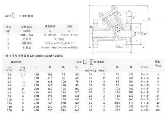 三、GL41F型襯氟過(guò)濾器型號(hào)規(guī)格 公稱壓力:1.0~2.5MPa 公稱通徑:20~450mm。