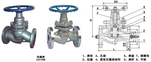 柱塞閥是由閥體、閥蓋、閥桿、柱塞、孔架、密環(huán)、手輪等零件組成(如圖)。當(dāng)手輪旋轉(zhuǎn)時,通過閥桿帶動柱塞在孔架中間上下往復(fù)運(yùn)動來完成閥門的開啟與關(guān)閉功能。在閥門中柱塞與密封環(huán)間采用過盈配合,通過調(diào)節(jié)壓蓋中法蘭螺栓,使密封環(huán)壓縮所產(chǎn)品生的側(cè)向力與閥體中孔面及柱塞外圓密封,從而保證了閥門的密封性,杜絕了內(nèi)泄漏、同時閥門開啟矩小、能實(shí)現(xiàn)閥門的迅速開啟和關(guān)閉。柱塞閥由于密封環(huán)采用回彈性強(qiáng)、耐磨性高的無毒新型密封材料,具有經(jīng)受長期高溫、高壓而不喪失彈性,所以密封性能可靠,經(jīng)久耐用。
