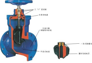 結(jié)構(gòu)特點 1.整體閥蓋暗桿設(shè)計,結(jié)構(gòu)緊湊;閥桿螺母與閘板兩體結(jié)構(gòu),無卡阻現(xiàn)象發(fā)生;直通道,無泄留凹腔;閥桿密封采用“O”形密封圈。 2.有優(yōu)秀的防腐性能,殼體內(nèi),外表面噴涂環(huán)氧樹脂,需要時內(nèi)表面襯搪瓷;連接螺栓采用內(nèi)六角螺栓,頂部膠封。 3.可靠的衛(wèi)生性環(huán)氧樹脂符合衛(wèi)生標(biāo)準GB/T17219-1998,閘板整體包覆符合衛(wèi)生檢驗的橡膠;閥桿、閥桿螺母等零件采用不受水腐蝕的不銹鋼或青銅等到材料。 適用飲用水、給排水、污水處理、天然氣與煤氣、工業(yè)以及食品等行業(yè)。