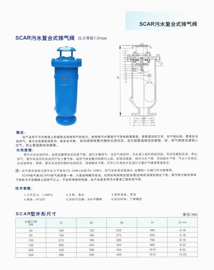 污水復合式排氣閥原理與CARX復合式排氣閥相同,只是將結構略作改動,即將閥體加高,杠桿機構稍微改動(如圖)。這樣控制部分降低,使污物只在閥體下部,不會纏繞上部排氣部分機構,不影響排氣,不致漏水,排氣量與CARX型相同。污水復合式排氣閥用于污水管道上的最高點或有閉氣的地方,來排除污水管道內氣體來疏通管道,使管道運轉正常。如不裝此閥,管道會出現閉氣,使污水流速受到影響,甚至會中斷,如出現停電管內隨時出現負壓,會引起管道振動或破裂,排、吸氣閥就迅速吸入空氣,防止管道振動或破裂。